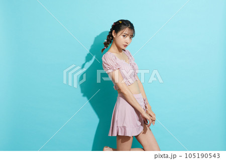 水着をきた若い女性の青背景のポートレート
