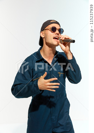 Portrait of young man, musician wearing overalls with sunglasses singing with microphone against white studio background.