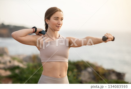 Glad confident strong millennial caucasian woman athlete in sportswear doing arm exercises with dumbbells, enjoy workout, body care alone at sea beach. Sports, fitness outdoor