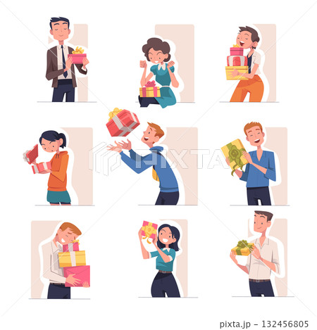 People with Gift Box Wrapped with Ribbon Vector Set