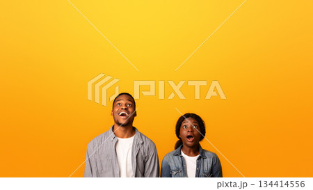 Portrait of amazed black man and woman looking up with opened mouth at copy space above their heads, dazed african american couple impressed by nice offer, standing isolated over yellow background