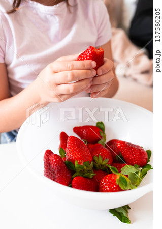Female child enjoying fresh strawberries from a bowl