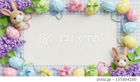 3D Easter Background with Ribbon Bow, Bunny, and Lilacs