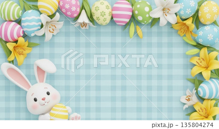 3D Easter Background with Bunny, Lilies, and Easter Eggs