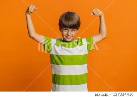 Fit sporty child boy kid showing biceps and looking healthy, feeling power strength success win