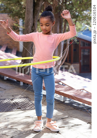 Playing with hula hoop, african american girl enjoying outdoor activity at school playground