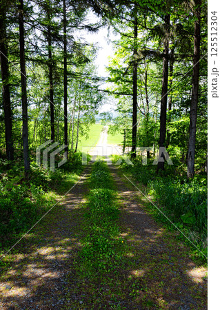 朝日に照らされる田植前の田んぼとあぜ道と重機(縦)