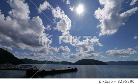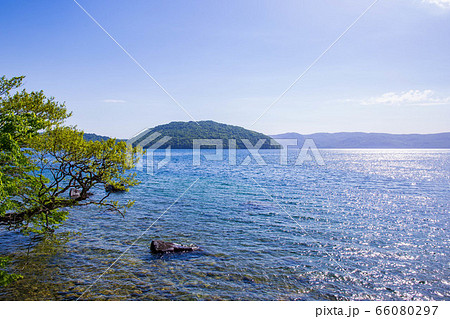 日本 青森県十和田市、十和田湖の子ノ口港から見える風景