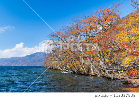 日本 青森県十和田市、十和田湖の子ノ口港から見える風景と紅葉
