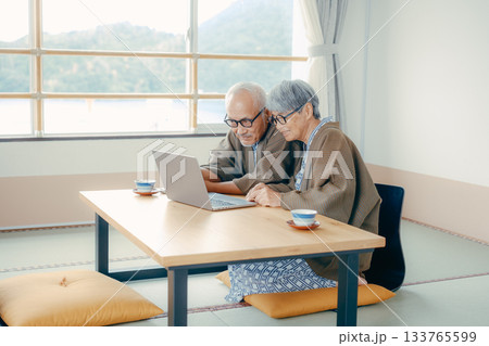 旅館の和室でパソコンとスマホを使うシニア夫婦