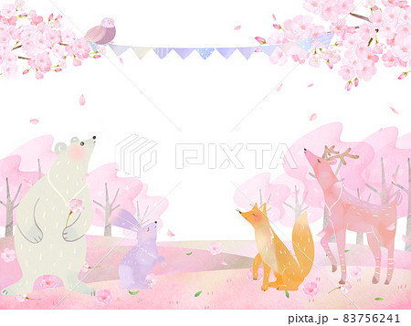 森の動物が満開の桜の木の下にいる春の北欧風かわいいフレームイラストベクター素材