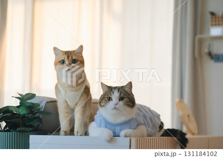 pet care concept with cat wear cloth and play with owner in living room