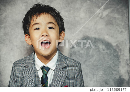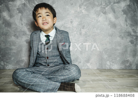 スーツ姿で座っている5歳児