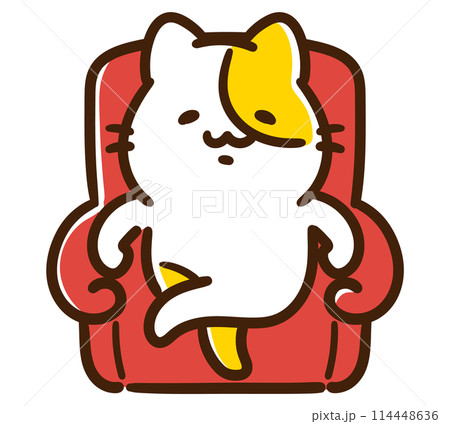 立派な赤いソファに座るかわいいねこのキャラクターのデフォルメイラスト