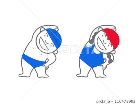 準備運動をする水着の男の子と女の子 青キャップ 赤キャップ