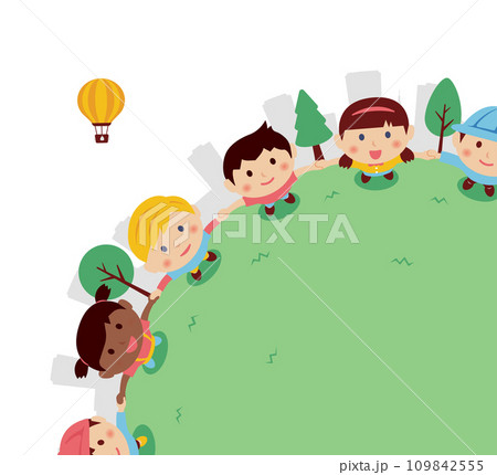 手をつないで空を見上げる子供たちのイラスト/様々な人種(緑の芝生) | コーナー・フッターデザイン用