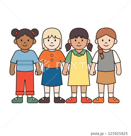 GIRLS HOLDING HANDS children illustration simple outline drawing character doodle diverse race and ethnicity people cute kawaii style
