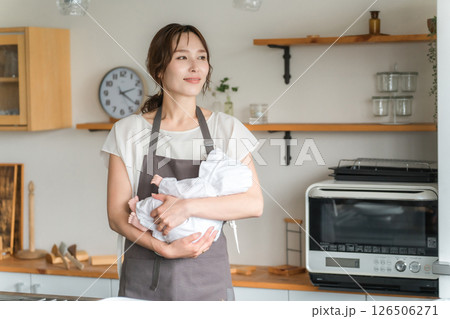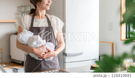 キッチンで赤ちゃんを抱っこする若いアジア人女性