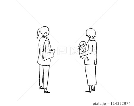 スーツを着た女性と、スーツを着て子供を抱く女性の後ろ姿、線画
