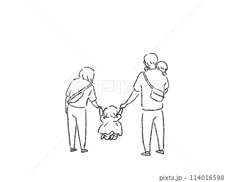 小さい子供をだっこする男性、子供(女の子)と手を繋いだ女性、親子の後ろ姿(父親、母親、子供二人)線画
