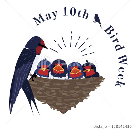 愛鳥週間のロゴとツバメの親子(巣とヒナ)のイラスト素材