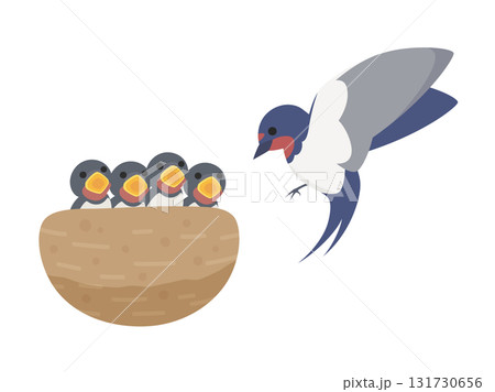 ツバメが雛鳥に餌をあげているイラスト