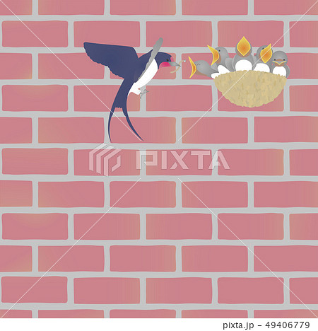 ツバメの親子とレンガの壁