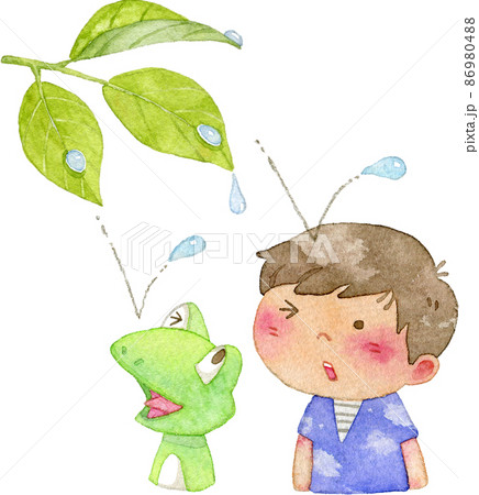 雨粒を頭に受ける男の子とカエルのイラスト