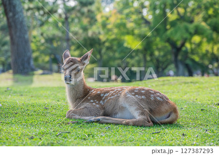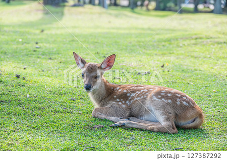 大木の根本でくつろぐ子鹿 奈良公園浅茅ケ原園地