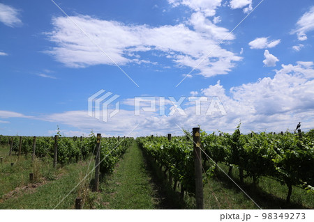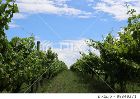 夏の青空の下で元気に育つワイン用のブドウ畑