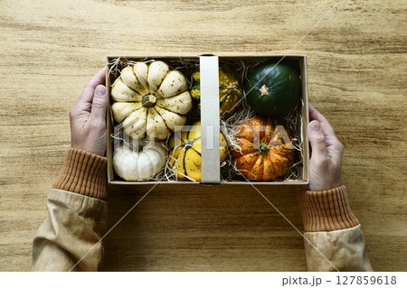 basket with pumpkin harvest in female hands