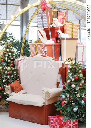 Festive Christmas decorations featuring a large plush chair surrounded by beautifully wrapped gifts and decorated trees in a vibrant public space creating a joyful holiday atmosphere