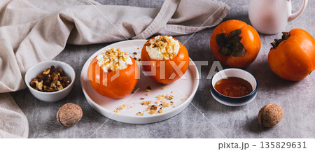 Ripe persimmon filled with cottage cheese, honey and nuts on a plate on the table web banner