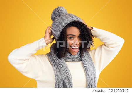Happy Winter Holidays. Smiling black woman wearing gray knitted hat and scarf over yellow studio background