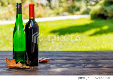 Wine bottles with grapes on a wooden table, glowing with sunny bokeh in the background