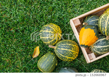 Various pumpkins in a wooden box on sunny green grass, autumn harvest scene