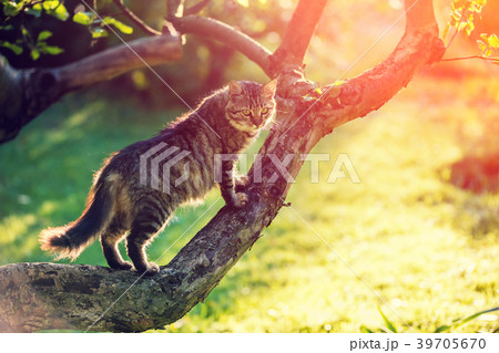 Cute cat sitting on a branch of the tree
