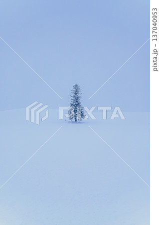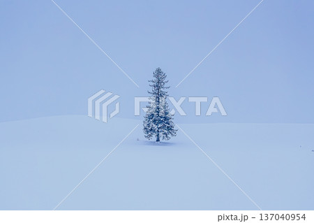 白銀の世界に浮かぶ孤高のクリスマスツリーの木 冬のミニマル風景