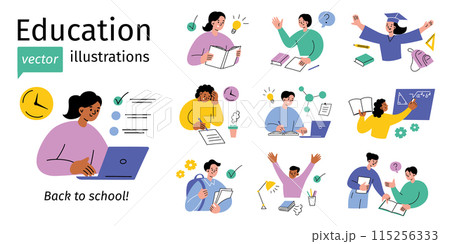 School and education vector illustrations set in playful, cartoon style. Students studying, reading books, stationery doodles, math science symbols collection. Educational content, learning materials