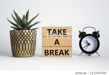 Take a break symbol. Concept words Take a break on wooden blocks. Beautiful white background with succulent plant and alarm clock. Business and Take a break concept. Copy space.