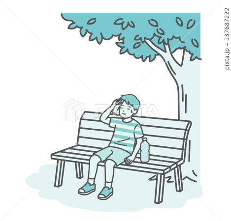 木陰のベンチで休憩して涼む男の子(子供)のイラスト