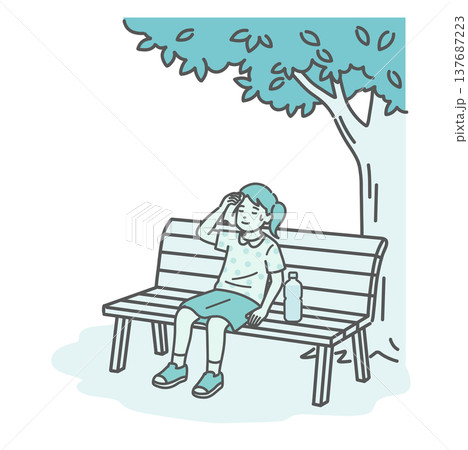 木陰のベンチで休憩して涼む女の子(子供)のイラスト