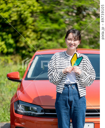 車の前で初心者マークを持つ笑顔の若い女性