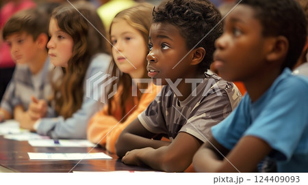 Students compete in a tense spelling bee, each spelling words with precision, aiming to win.