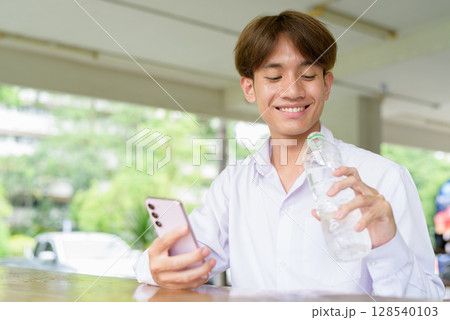 Teenager holding smartphone and leaning against wall, smiling at high school