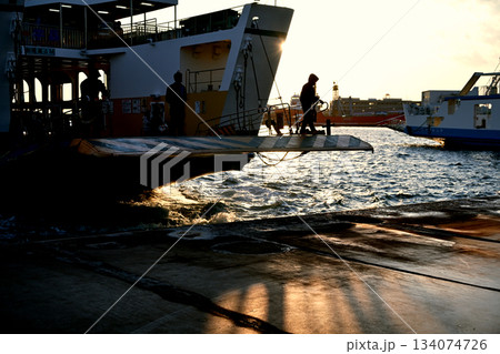 キッラキラの夕陽を背にフェリー着岸!