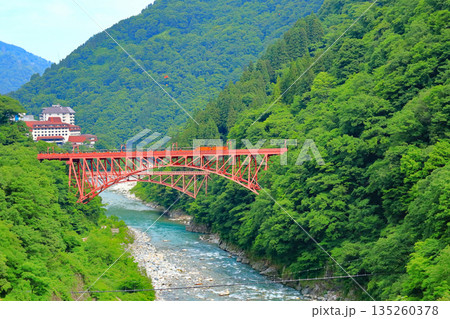 鉄橋を渡る黒部峡谷トロッコ電車 富山県黒部市