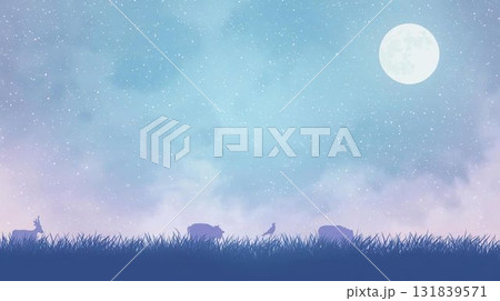 淡いブルーとパープルを基調とした夜空背景。動物のシルエット。
