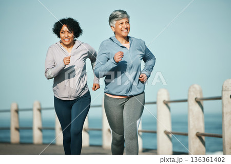 Fitness, running and senior women at beach for health, wellness and exercise in nature together. Elderly, friends and ladies at sea happy, workout and active retirement, fun and bonding ocean run