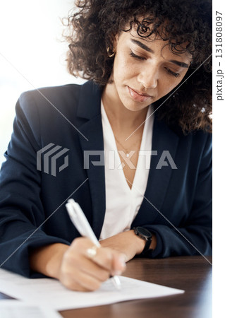 Paper, writing and woman lawyer in office with document, form and planning on white background space. Legal, firm and female write notes on information, schedule or reminder while working on a case
